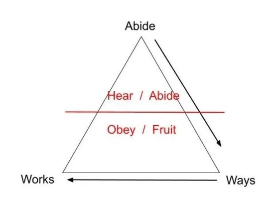 As they progress in their understanding of what abiding in Him, walking in His ways and doing His works looks like and the flow from one to the other as source and fruit. You can introduce them to splitting the top ½ and bottom ½ of the triangle to be “hear/abide” and “obey/fruit.”