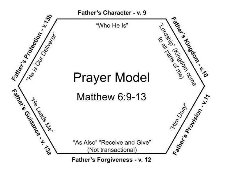 Purpose: The Lord’s Prayer is the most commonly recited prayer. This tool is to help understand the different concepts Jesus used as He modeled for the disciples how to pray instead of focusing on the words of the prayer. Praying through each component of the model will eventually lead you to pause and reflect on what the Lord wants to speak to you. When you get hung up, reflect on why. Let each component reset yourself to the King and His Kingdom.